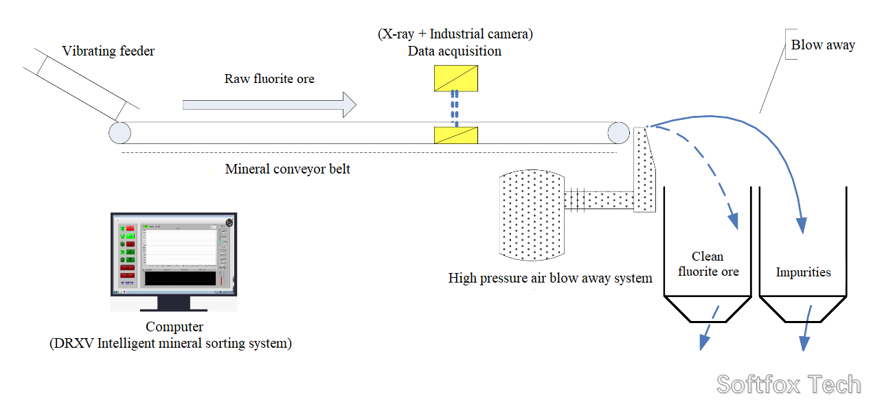 's X-ray image and industrial camera image fusion recognition technology is used to sort fluorite ore according to product grade from the fluorite source ore, removing impurities such as potassium feldspar, barite, dolomite and quartz.